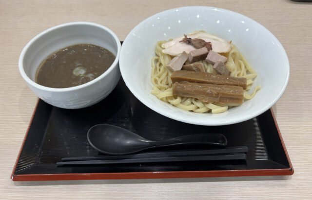 森住製麺の平打ち形状の太麺は、モチモチの食感で、イカ煮干し🦑特有のコクを感じるつけ汁と相性抜群です。トッピングは、太めのメンマに、低温調理の鶏ムネチャーシュー、豚コロチャーにイカ煮干しがひとつ添えられています。