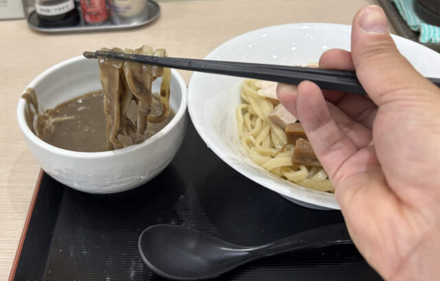 こちらの平打ち形状の太麺が、濃度のあるつけ汁をしっかり受け止めます。麺量は200gあり、ボリュームもあります👍。やはり、イカ煮干し特有のコクや風味が最大のポイント💡だと思います。