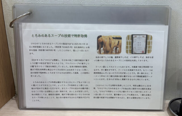けのひさんは、とろみのついたスープで特許を取っています。濃厚煮干しそば、イカ煮干しそば、そのほかさまざまなメニューは、この製法で作られています❗❗。