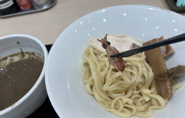 森住製麺の平打ち形状の太麺は、モチモチの食感で、イカ煮干し🦑特有のコクを感じるつけ汁と相性抜群です。トッピングは、太めのメンマに、低温調理の鶏ムネチャーシュー、豚コロチャーにイカ煮干しがひとつ添えられています。