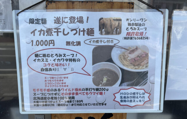 メニューが増えてきたので、いろいろと整理をしつつ、限定麺という形で新作や人気だったメニューを再販していくようにしたと話す店主の佐藤さん👨🍳。人気のイカ煮干しそばのつけ麺バージョーンは、つけ麺好きやイカ煮干し好き、両方に刺さるメニューだと思います。店内には過去の限定麺などが壁に貼ってあるので、そのメニューの遍歴などを見ながら、ラーメンを食べても面白いと思います🙆。