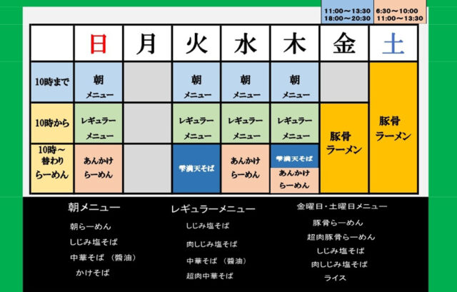 こちらのお店はレギュラーメニューのほか、朝ラー限定麺、10時~の変わりラーメン、金・土曜限定の豚骨ラーメンなど、時間帯や曜日によっても異なるラーメンを楽しめるのがおもしろいところ😊。営業時間なども、変更になる場合があるので、詳細はお店のSNSを確認してみましょう👀
