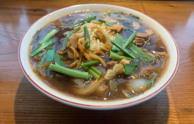 豚のうま味あふれるスープ🥣に、たまり醤油や淡口醤油など5種類の醤油やみりん、赤酒などをブレンドした甘みのあるタレを合わせます。タケノコ、白菜、豚バラ、タマネギ、ニラなどを炒めて合わせた、クセになる味わいが特徴です麺は、ゴワゴワ系のオーション麺を合わせています🙆。