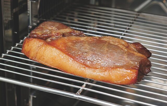 チャーシューは煮豚ではなく焼き豚🍖。表面にハチミツを塗り重ね、オーブンで香ばしく焼き上げて甘い照りをつけています。