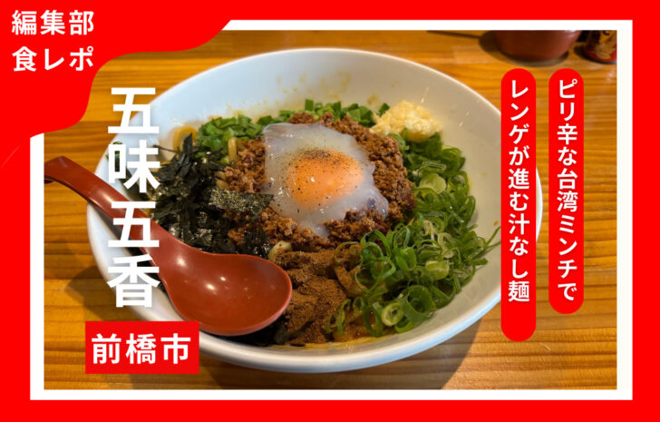 前橋市総社町にある「五味五香」さんです。昼のみ営業で、日曜・祝日はお休みというなかなかハードルが高いお店ですが、編集部の事務所は前橋市の県庁付近にあるため、お昼に訪れることの多いお店です。これまで、つけ麺、まぜそば、ガッツリ系の背脂野菜ラーメンなどのレポートをしてきましたが、今回は過去に食べたことがありながら、間が空いてしまって記憶がおぼろげだった「台湾まぜそば」を求めて、食べに行ってきました。