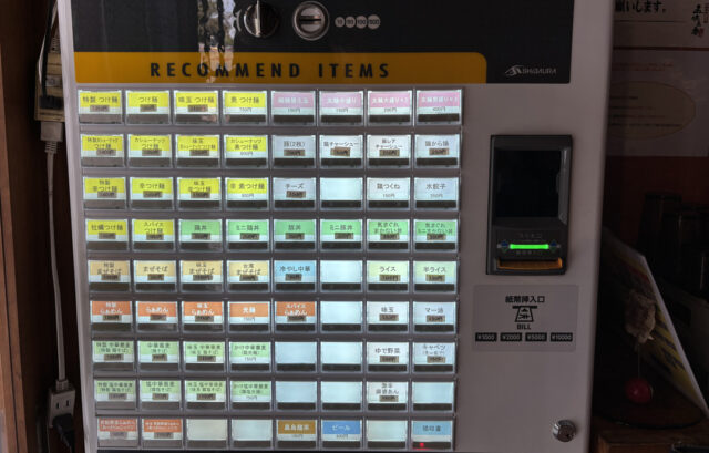 こちらのお店は券売機制です。1万円札も対応している最新タイプかと思いますが、左上の上から、つけ麺、まぜそば、らぁめん、背脂野菜らーめんといった順番でメニューが並んでいます。五味五香さんはメニューも多いのですが、どのメニューのクオリティーも高いのがポイントです。