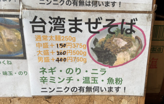 今回注文したのはこちら!台湾まぜそばです。太麺250gでボリューム満点です。