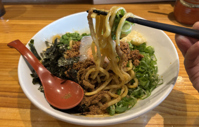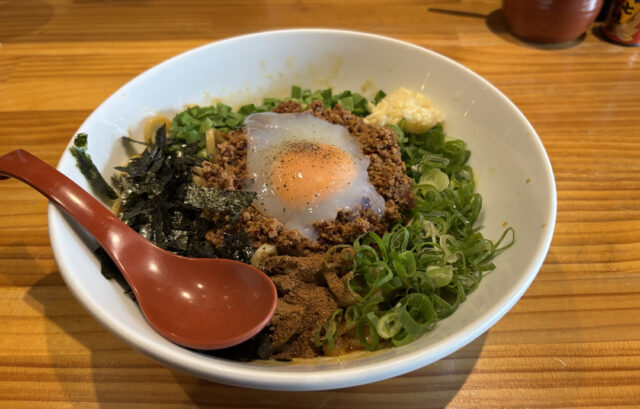 着鈍した一杯はこのボリューム感で1,000円というコスパが高い印象。ニラ、ネギ、のり、魚粉、中央のうま辛な台湾ミンチの上には、半熟卵が鎮座しています。ニンニクは注文時に有無を確認されますが、ニンニクありだと、よりうま味が増し、クセになる味わいを演出してくれます。
