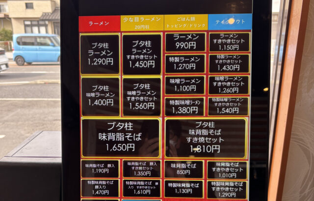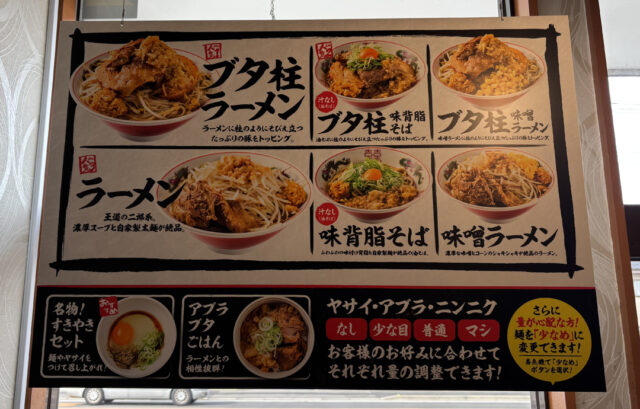 基本的には、二郎系のラーメン、味噌ラーメン、汁なしの味背脂そばの3本柱に、人気の豚を加えた「豚柱」シリーズで構成されていて、すき焼きセットやアブラブタごはんなどのサイドメニューも用意されています。二郎系特有の注文方法である、「コール」はヤサイ、アブラ、ニンニクでそれぞれ、なし、少な目、不通、マシで調整ができます。