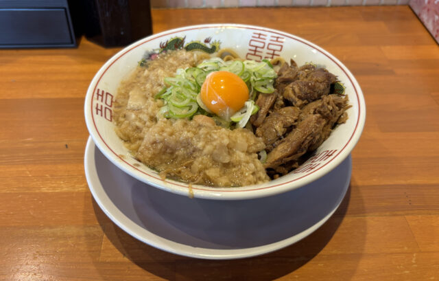 基本的には、二郎系のラーメン、味噌ラーメン、汁なしの味背脂そばの3本柱に、人気の豚を加えた「豚柱」シリーズで構成されていて、すき焼きセットやアブラブタごはんなどのサイドメニューも用意されています。二郎系特有の注文方法である、「コール」はヤサイ、アブラ、ニンニクでそれぞれ、なし、少な目、不通、マシで調整ができます。