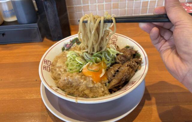 麺のリフトです。自家製の極太ストレート麺はすすり心地もよく、噛むたびに小麦の香りが広がります。スープがない汁なし麺とだけあって、主役はこの麺ですね。フワフワの味付き背脂と絡めて食べたりみたり、卵黄と絡めて食べると味がマイルドになったりして、これはいいですね♪