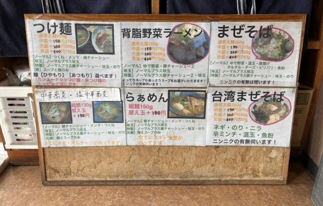 簡単なメニュー紹介が書いてあるボードがありますので、初めての来店時には参考にしてみてください。細麺は麺量150g、太麺は麺量250gがベースになっています。