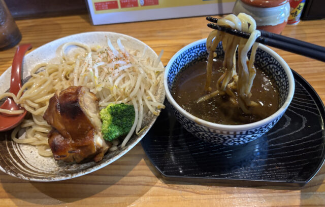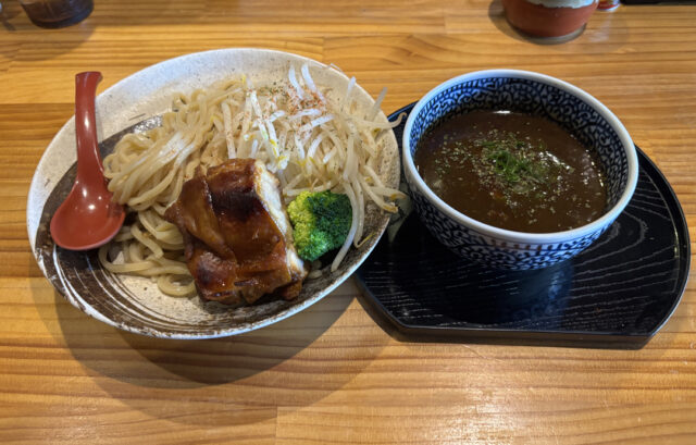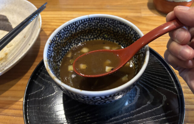 濃厚なつけ汁は、黒っぽいビジュアル。たくさんのスパイスを使っているのがわかります。そして肝心な味は、「カレーのような…」という店員さんの言葉の通り、カレーではないのですが、どこかに、カレーのスパイシー感を感じます。そしてその味が太麺と絡みつきます。このつけ汁おいしいです。