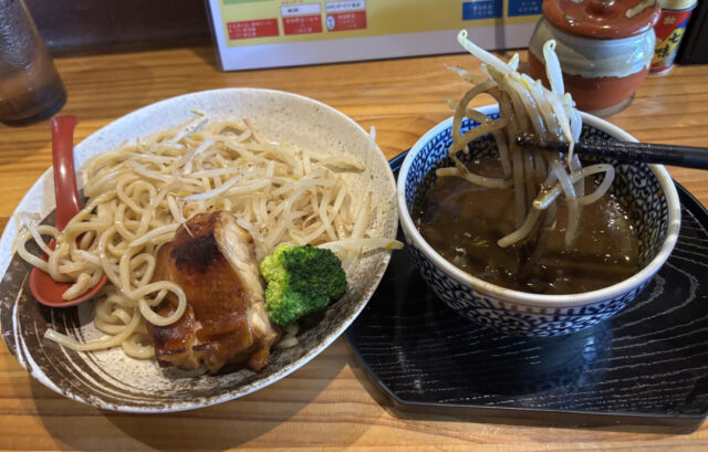 着丼して、まずその色、そして独特の香りに少しぶっくりします。また、麺に付くトッピングの野菜もブロッコリーやモヤシなので、通常のつけ麺とは毛色が違いますね・・・。