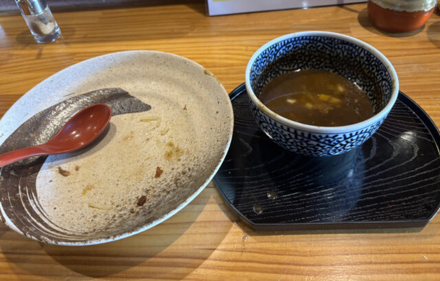 麺とモヤシを交互に食べて、時よりグリルした鶏チャーシューも加えながら、あっという間に完食しました。そして最後は、スープ割りです。