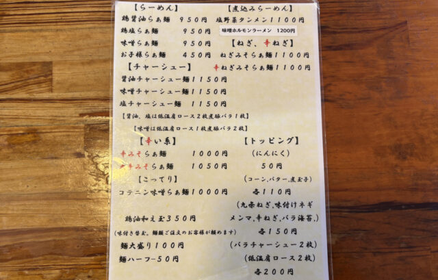 メインメニューは、鶏清湯を主体とした淡麗系の醤油と塩ラーメン、ファンがいる味噌ラーメン🍜、辛味噌や煮込み系のラーメンや和え玉もラインナップ🔍。お昼はお得なランチセットが登場します✨。私もランチ時に伺いましたが、ミニチャーハンがかなり出てましたので、次回はデフォのラーメン+Cランチ(半チャーハン)を頼もうと心に誓いました👓。