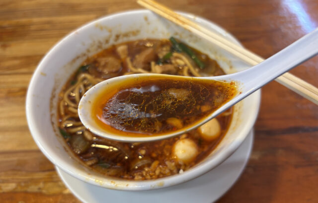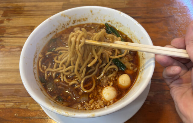 スープは豚主体の清湯スープに3種類の醤油で作ったカエシを合わせて、辛みを付けます。タマネギ、ニラ、豚肉を炒めて投入。背脂、ショウガ、ニンニクは好みで加えることができます。濃い目の味の分、麺のうまさがきちんと引き立つ設計になっています👌。タマネギの甘みもアクセントになっていて、いいですね。辛いのが好きな人にはお勧めですが、私は汗をダラダラかきながら食べました🤩(笑)